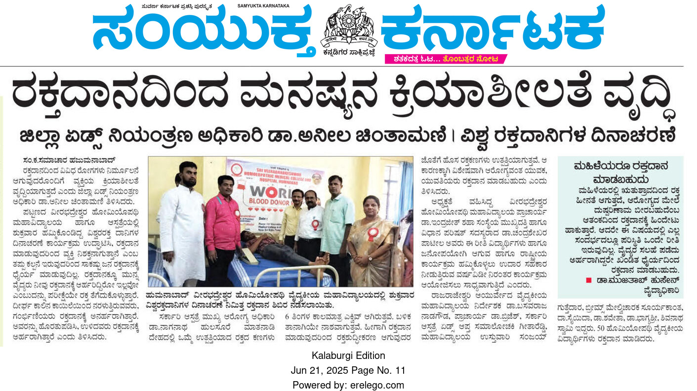On the occasion of World Blood Donor Day, a Blood Donation Camp was successfully organized at Sri Veerabhadreshwar Homoeopathic Medical College and Hospital (SVHMCH), Humnabad, in collaboration with Government Hospital Humnabad and BRIMS, Bidar. The camp began at 9:30 a.m. and witnessed enthusiastic participation from students, faculty, parents, and healthcare professionals.