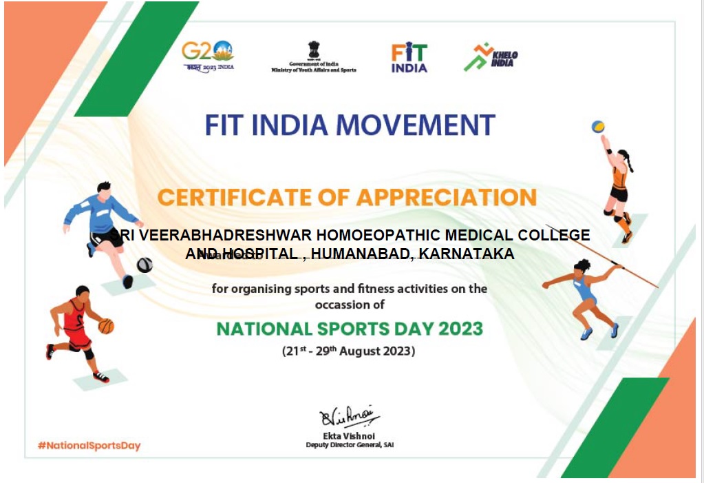 As per the guidelines and directions set by the Ministry of Youth Affairs and Sports, Ministry of AYUSH, and the National Commission for Homoeopathy (NCH) in New Delhi, National Sports Day 2023 celebrated at Sri Veerabhadreshwar Homoeopathic Medical College and Hospital, Humnabad. Karnataka on 28 and 29 August 2023.